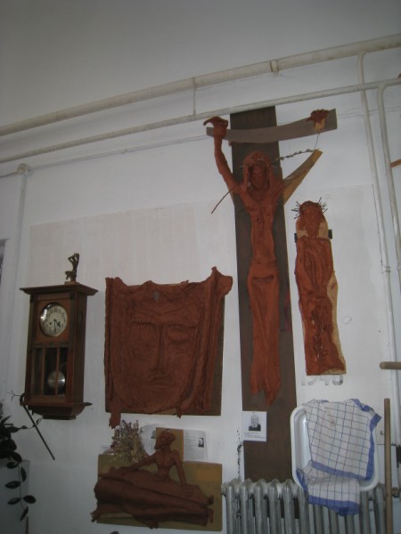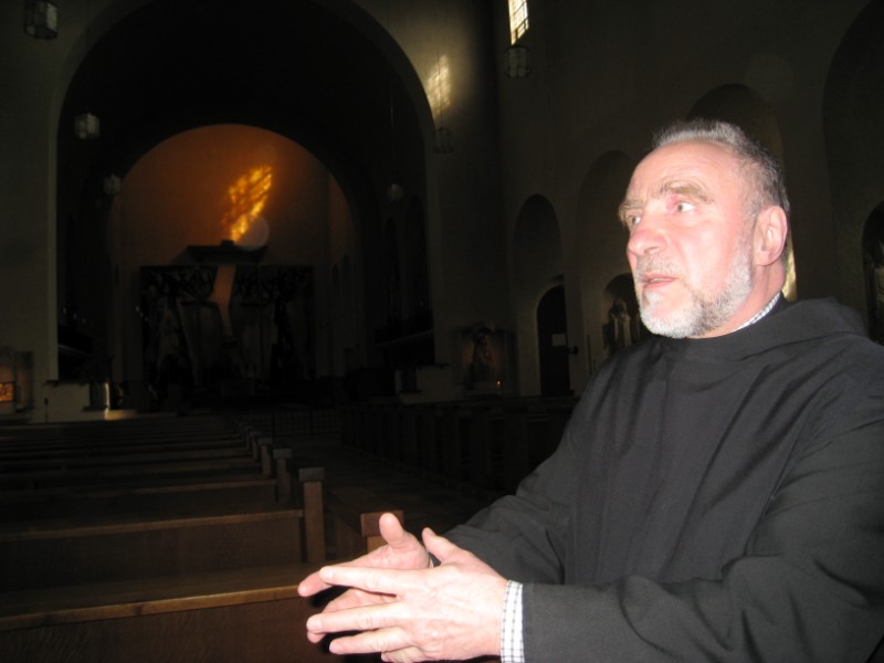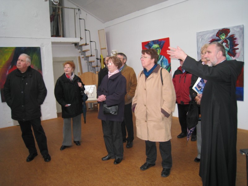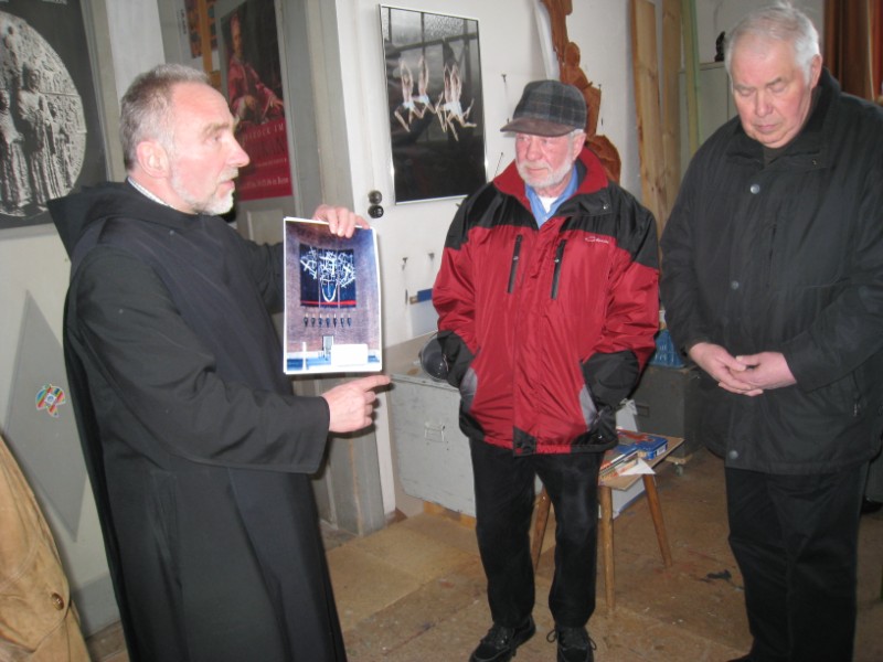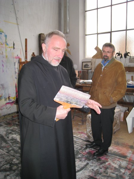 Zu Beginn der Passionszeit führte Pater Meinrad Dufner OSB Kommunionhelfer, Lektoren und Gottesdienstbeauftragte der drei Würzburger Dekanate am Samstag, 28. März 2009, in das Mysterium des kontemplativen Schauens ein. Das von ihm geschaffene 9,50 mal 13,50 Meter große Schweißtuch in der Abteikirche Münsterschwarzach knüpft an die über 1000jährige Tradition der Fastentücher an. Dem Fasten durch Essen wurde ein Fasten des Sehens hinzugestellt. So sind vom Passionssonntag bis Karsamstag in allen katholischen Kirchen die Kreuzdarstellungen verhüllt. "Am Hungertuch nagen" wird gewandelt in die Worte des Psalmisten "Dein Antlitz will ich suchen, Herr". Viel Schwarz, viel Dunkel, das Dunkel der Welt aus Leid, Schmerz und Schuld. Das Münsterschwarzacher Hungertuch assoziiert einen Putzlappen. Gott hat sich zum Putzlappen der Welt gemacht, um uns reinzuwaschen. Ein Gesicht tritt hervor. Gott ist kein Wegschauer. Jesus ist als Gesicht in jedem Leid und schweigt aus, und versöhnt nach innen: "Vater, vergib ihnen". Ein weiterer Höhepunkt war der Besuch im Atelier von Pater Meinrad.