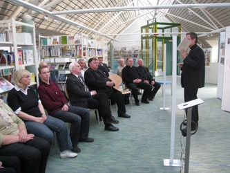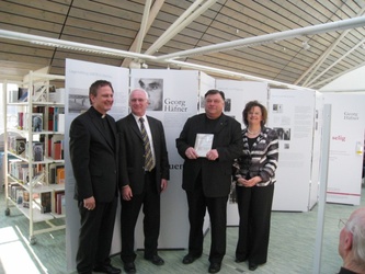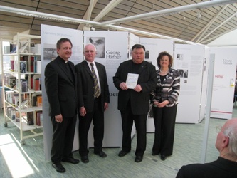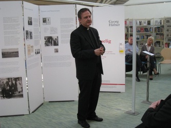 Dekan Walter Lederer, Bürgermeister Peter Stichler und Domdekan Günter Putz eröffneten am Montag, 28. März 2011, für das Dekanat Würzburg links des Mains die Wanderausstellung des Diözesanarchivs. Monsignore Putz, Postulator im Seligsprechungsverfahren, zeigte sich besonders erfreut, dass diese in der Gemeindebücherei in Höchberg zu sehen ist, und somit einem breiten Publikum das Leben des Märtyrerpriesters Georg Häfner zugänglich gemacht wird. Die Ausstellung umfasst acht Tafeln und legt den Schwerpunkt auf das Leiden und und Sterben Häfners im Konzentrationslager Dachau. Neben einer Beschreibung der unmenschlichen Dachauer Lagerverhältnisse findet sich eine Rückblende auf die Situation Häfners als Priester in der Diktatur der Nationalsozialisten. Eine Hörstation bietet Auszüge aus Häfners Briefen aus der Haft, außerdem Stellungnahmen von Bischof Friedhelm Hofmann, Weihbischof Ulrich Boom und Domdekan Putz. Die Ausstellung ist in der Gemeindebücherei Höchberg in der Martin-Wilhelm-Straße 2 ist bis 12. April zu folgenden Zeiten zu sehen: Dienstag bis Freitag von 10.00 bis 18.00 Uhr, Donnerstag bis 19.00 Uhr, Samstag 9.00 bis 14.00 Uhr.