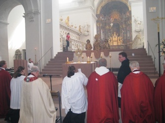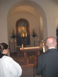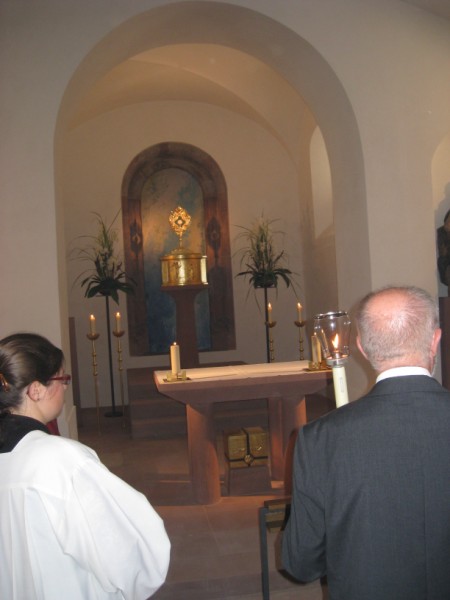 Mit einem Pontifikalamt am Hochfest der Apostel Petrus und Paulus am Montag, 29. Juni, eröffnete Bischof Dr. Friedhelm Hofmann nach zweijähriger Renovierungsarbeit die eucharistische Anbetung im Neumünster. Groß war die Schar der Mitfeiernden, darunter die vielen Frauen und Männer, die ein- oder mehrere Male im Montag eine Stunde die stille, eucharistische Anbetung mittragen. Im Anschluss an den Gottesdienst übertrug Bischof Friedhelm in einer eucharistischen Prozession, zusammen mit den Konzelebranten und Gläubigen, das Allerheiligste in die Anbetungskapelle der Kreuzkrypta. Dort besteht an Werktagen von 7 bis 17 Uhr und sonntags von 10 bis 17 Uhr die Möglichkeit der eucharistischen Anbetung. Am ersten Donnerstag im Monat, dem Gebetstag um geistliche Berufe, ist das Allerheiligste bis 21 Uhr ausgesetzt. Diese Gebetsstunden werden mit einer Eucharistiefeier um 21 Uhr abgeschlossen. Für die Organisation der Anbetung ist das Diözesanbüro Würzburg verantwortlich.