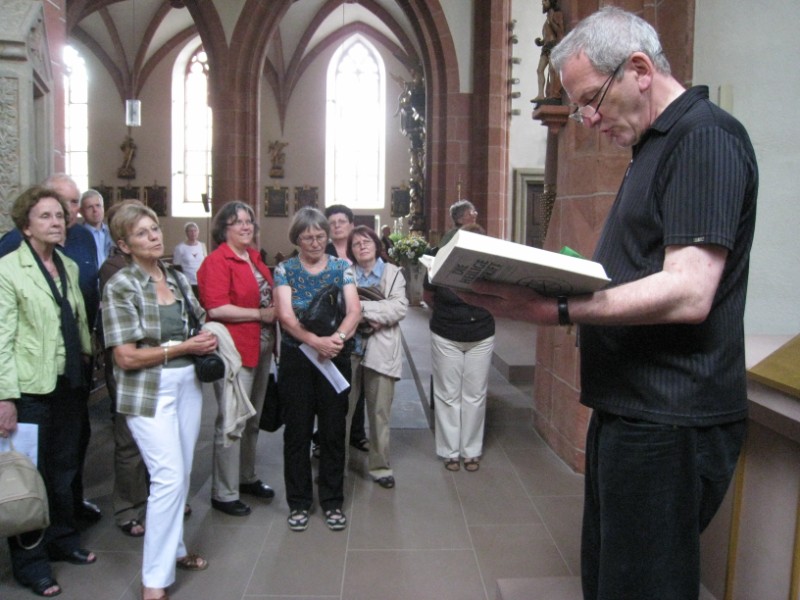 In die nonverbale Botschaft der Kirchenräume führte am Samstag, 12. Juni 2010, Domkapitular Dr. Jürgen Lenssen 50 Kommunionhelfer, Lektoren und Gottesdienstbeauftragte ein. Die Studienfahrt unter dem Leitwort "Raum und Bild" hatte neu gestaltete Pfarr- und Wallfahrtskirchen im östlichen Teil der Diözese Würzburg zum Ziel. Die Route führte zunächst zur -von Würzburger Jesuiten erbauten- Lorettowallfahrtskirche nach Effeldorf. Hier konnten die TeilnehmerInnen unter anderem die freigelegten Fresken im Chorraum der kleinen Kirche bestaunen. Weiter ging es ins benachbarte Euerfeld. Die im 17. Jahrhundert entstandene Pfarrkirche St. Michael erhielt bei der Renovierung durch den neu gestalteten Altar, um den sich die Gemeinde zum Gottesdienst versammelt, und den diesen umschließenden Radleuchter eine neue Mitte. In Grettstadt nahe Schweinfurt wurde erst kürzlich die Innenrenovierung der Pfarrkirche St. Peter und Paul abgeschlossen. Beeindruckt hat hier die einheitliche schöne Rokkoko-Ausstattung aus der Werkstatt Peter Wagners. Noch ist die Renovierung der Ritterkapelle in Haßfurt nicht abgeschlossen. Aber mit dem Bau- und Kunstreferenten der Diözese öffnen sich auch Kirchentüren, die offiziell noch verschlossen sind. Der Baubeginn dieser marianischen Wallfahrtskirche geht ins 15. Jahrhundert zurück. Bei den noch andauernden Renovierungsarbeiten konnte die reichhaltige Dekorierung des Gewölbes wieder in ihren Ausgangszustand versetzt werden. Auch hier entsteht eine Altarinsel, an deren Ende in einer Stele die beiden Pietás ihren Platz finden. Gerade diese Neugestaltung sorgte in den letzten Monaten in Haßfurt für viel Aufregung. Nach einer ausgiebigen Mittagspause in der "Brauereigaststätte Göller" in Zeil am Main waren noch zwei Kirchen in den Haßbergen auf dem Programm: Der 56 Seelen zählende Weiler Neuses am Rauheneck beherbergt ebenfalls eine kleine, im Jahr 1717 von Fürstbischof Johann Philipp von Greifenclau gestiftete, Marienwallfahrtskirche. Die Einwohner, für die die Kirche der Mittelpunkt íhres kleinen Dorfes ist, gaben dem Kunstreferenten bei der Innenrenovierung freie Hand: Sie wollten etwas "Modernes". Daraus ist ein Kunstwerk enstanden, das niemand erahnt, der vor der Kirche an der Dorfkreuzung steht. Ein vor wenigen Jahren entstandener Brand zerstörte den rechten Seitenalter in der Ebener Pfarrkirche St. Laurentius. Dieses Unglück wandelte sich inzwischen zu einem Glanzstück. Der neugestaltete Altaraufsatz von Michael Triegel ist Anziehungspunkt für viele Kirchenbesucher. Der Leipziger Künstler verstand es, in der Darstellung des Bekehrung des Heiligen Paulus seine eigenen Sehnsüchte und Zweifel ins Bild zu fassen. Groß war das Lob aller TeilnehmerInnen am Ende des Tages. In zwei Jahren wird die Kirchenfahrt in den Westteil der Diözese ihre Fortsetzung finden.