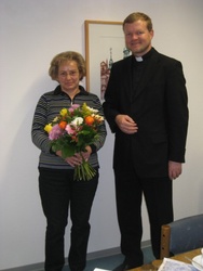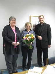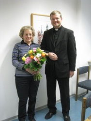 In einer kleinen Feierstunde am Dienstag, 2. November 2010, dankte Dekan Dr. Jürgen Vorndran Frau Renate Schmitt für ihre 10jährige Tätigkeit im Katholischen Matrikelamt. Sie und Frau Brigitte Scherm, Leiterin des Matrikelamtes, verwalten alle kirchlichen Dokumente der rund 70.000 Katholiken der Domstadt. Das Führen und sichere Verwahren der sogenannten Matrikelbücher, der Tauf-, Firm-, Trauungs- und Verstorbenenregister gehört nach Kanon 470 des kirchlichen Gesetzbuches zu den wichtigen Aufgaben eines katholischen Pfarrers. Dekan Dr. Vorndran betonte, wie wichtig ihm die in der Diözese einmalige Stelle ist. Müssen diese Einträge in den Landgemeinden oft in der hektischen Atmosphäre eines Pfarrbüros getätigt werden, so können in Würzburg diese wichtigen Daten eines jeden Katholiken mit Ruhe und Sorgfalt bearbeitet werden. Dieser Dienst, den viele katholische Christen überhaupt nicht kennen, spiegelt das Leben des einzelnen Katholiken wider.