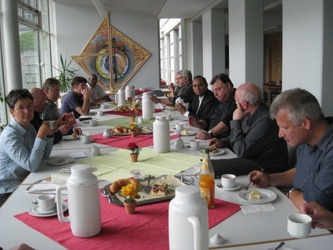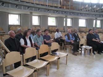 Über die Seelsorge in der Justizvollzugsanstalt Würzburg informierten sich die Seelsorgerinnen und Seelsorger des Dekanates Würzburg links des Mains am 27. Juli 2010. Josef Gerspitzer, katholischer Seelsorger in der JVA, ist mit seinem evangelischen Kollegen Ansprechpartner für über 600 Gefangene. Diese auf ein Leben nach dem "Knast" vorzubereiten, ist neben Gesprächen, Gottesdiensten und dem Kontakt zu Angehörigen, ein Schwerpunkt der seelsorgerlichen Arbeit. Über die menschenfreundlichen Bedingungen innerhalb des Gefängnisses konnten sich die SeelsorgerInnen bei ihrem Rundgang überzeugen. Sowohl die Hafträume wie die Gemeinschaftseinrichtungen sind fern der Vorstellung eines düsteren Zuchthauses. Man spürt, dass man die schuldig Gewordenen resozialisieren will. Umso mehr bedarf es in der streng geregelten Welt eines Gefängnisses Gelegenheit zu persönlichen Begegnungen. Dafür steht die Gefängnisseelsorge.