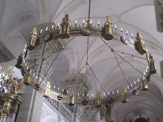 Radleuchter in der Stiftskirche der Großcomburg. Er ist mit seinen 16 Meter Durchmesser wohl der größte in Deutschland. Seine zwölf Türme stellen das himmlische Jerusalem dar.