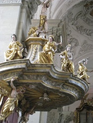 Die Kanzel, wie die gesamte barocke Innengestaltung, ist ein Werk des Würzburger Künstlers Greising. Hier die sieben Todsüden, dargestellt in den sieben Frauen auf dem Schalldeckel der prächtigen Kanzel.