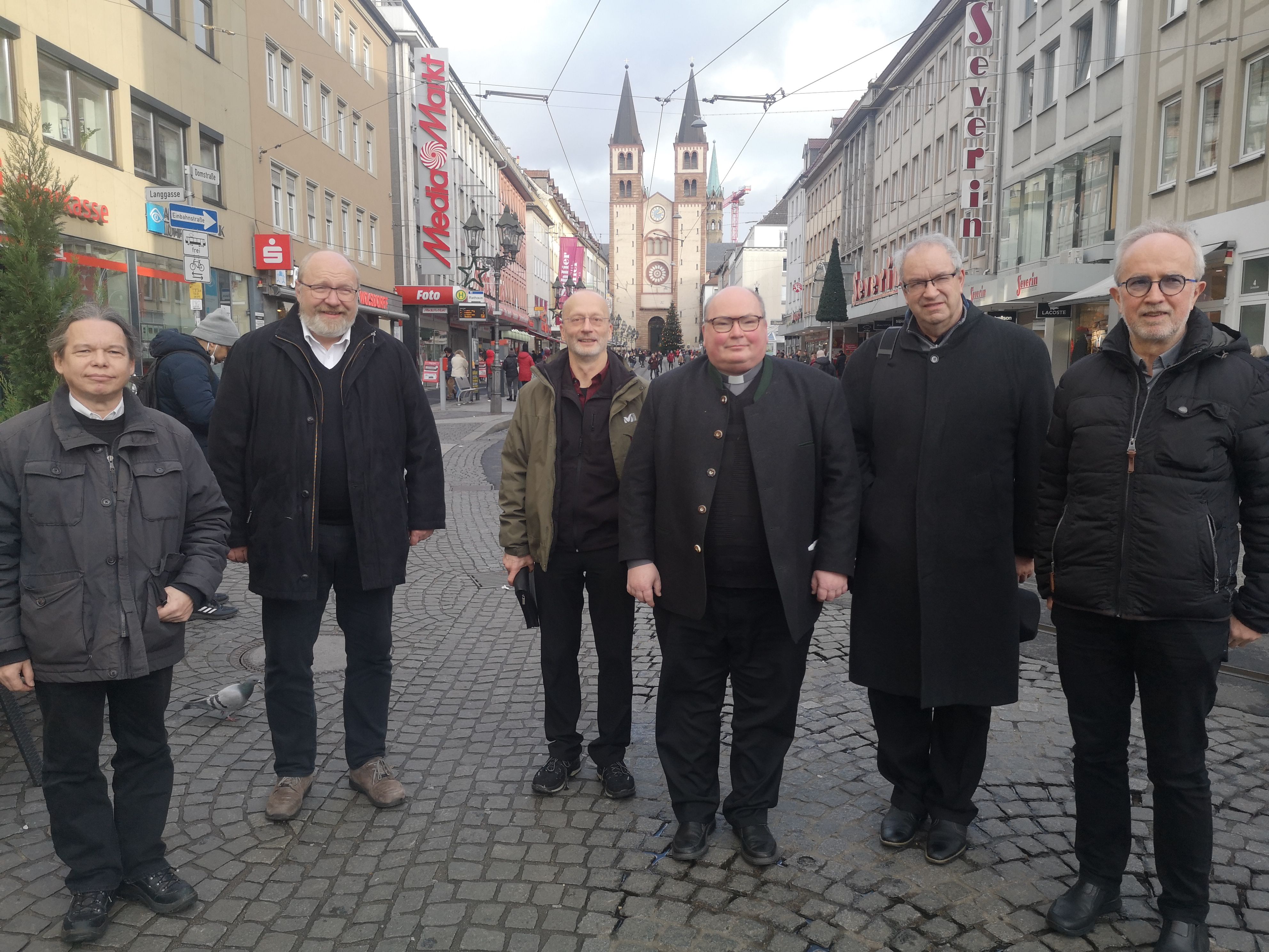 Mit der Errichtung des neuen Dekanates Würzburg und der Wahl von Pfarrer Stefan Gessner zum Dekan, ging auch die Ära der Dekane in den ehemaligen Dekanaten Würzburg-Stadt, Würzburg links des Mains, Würzburg rechts des Mains und Ochsenfurt zu Ende. Am Samstag, 8. Januar 2022, kamen alle vier Dekane und deren Stellvertreter zu einem gemeinsamen Essen in Würzburg zusammen. Dies sollte Ausdruck des Dankes und der Wertschätzung für die geleistete Arbeit sein. Auf dem Photo von links: Gregor Sauer, Oswald Sternagel, Berthold Grönert, Stefan Gessner, Helmut Rügamer und Werner Vollmuth. Es fehlt Dr. Paul Julian.