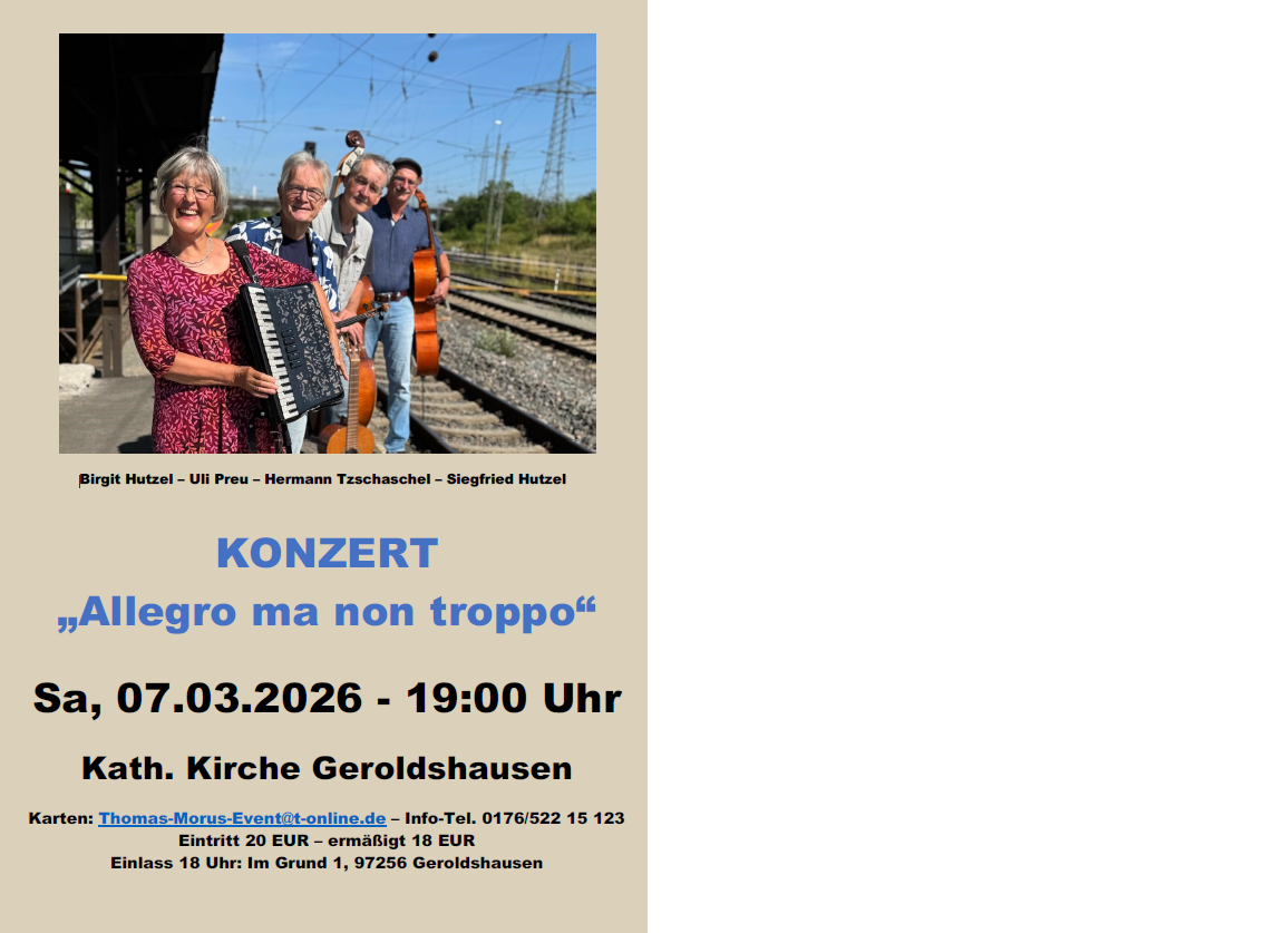 „Unterwegs“ ist der Titel des neuen Programms der Gruppe „Allegro ma non troppo“. Die drei Herren mit Dame nehmen das Publikum mit auf eine musikalische Reise in die Fremde und zu uns selbst. Die Texte und die Musik sind wie die Menschen, denen wir begegnen: bunt, fröhlich, heiter, ausgelassen, aber auch besinnlich und träumerisch.
