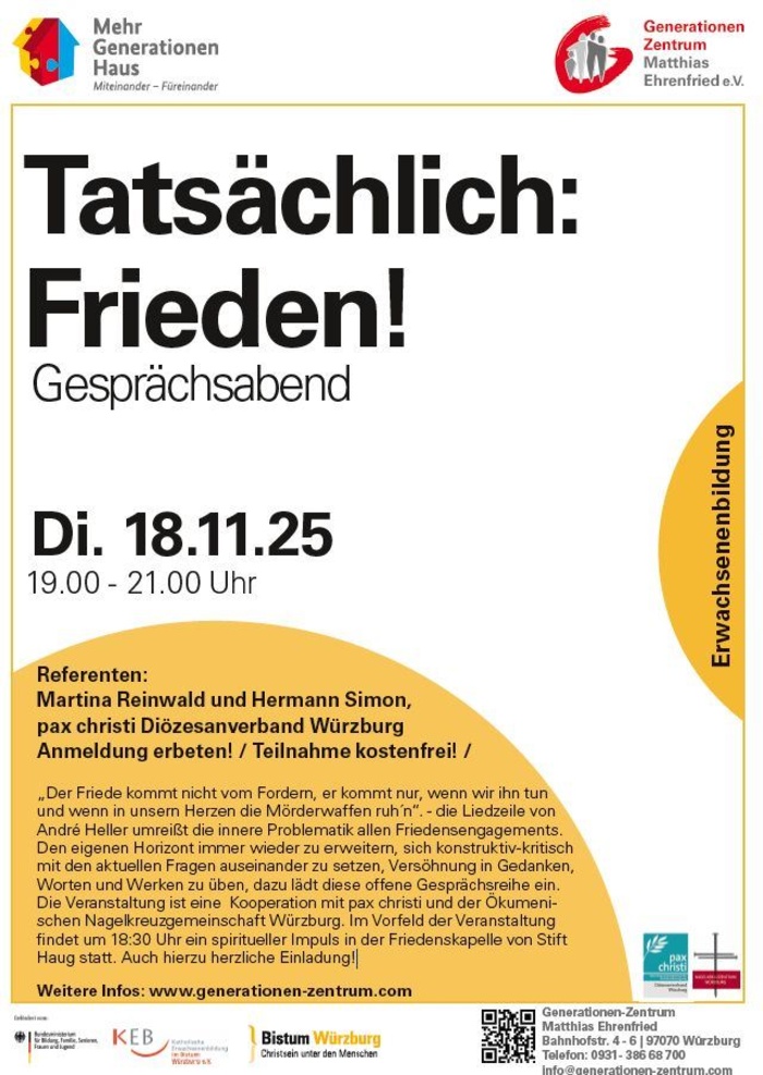 „Der Friede kommt nicht vom Fordern, er kommt nur, wenn wir ihn tun und wenn in unsern Herzen die Mörderwaffen ruh´n“. - die Liedzeile von André Heller umreißt die innere Problematik allen Friedensengagements. Den eigenen Horizont immer wieder zu erweitern, sich konstruktiv-kritisch mit den aktuellen Fragen auseinander zu setzen, Versöhnung in Gedanken, Worten und Werken zu üben, dazu lädt diese offene Gesprächsreihe ein. Die Veranstaltung ist eine Kooperation mit pax christi und der Ökumenischen Nagelkreuzgemeinschaft Würzburg. Im Vorfeld der Veranstaltung findet um 18:30 Uhr ein spiritueller Impuls in der Friedenskapelle von Stift Haug statt. Auch hierzu herzliche Einladung!