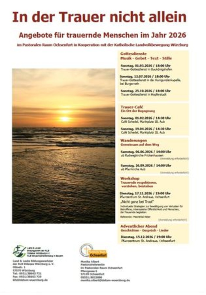 Wir, der Pastorale Raum Ochsenfurt und die Kath. Landvolkbewegung, laden zu einer gemeinsamen Wanderung für trauerne Menschen ein. In achtsamer Atmosphäre gehen wir ein Stück Weg zusammen - mit Zeit und Raum für Gespräche, aber auch für Stille. Jede:r darf so sein, wie er oder sie sich gerade fühlt.