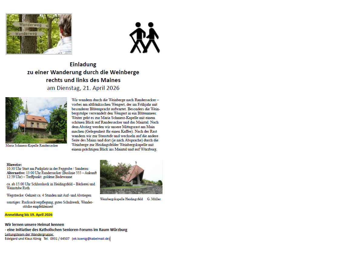 Anmeldung erbeten bis Sonntag, 19. April 2026 bei Edelgard u. Klaus König: ek.koenig@kabelmail.de oder Tel. 0931 / 64507